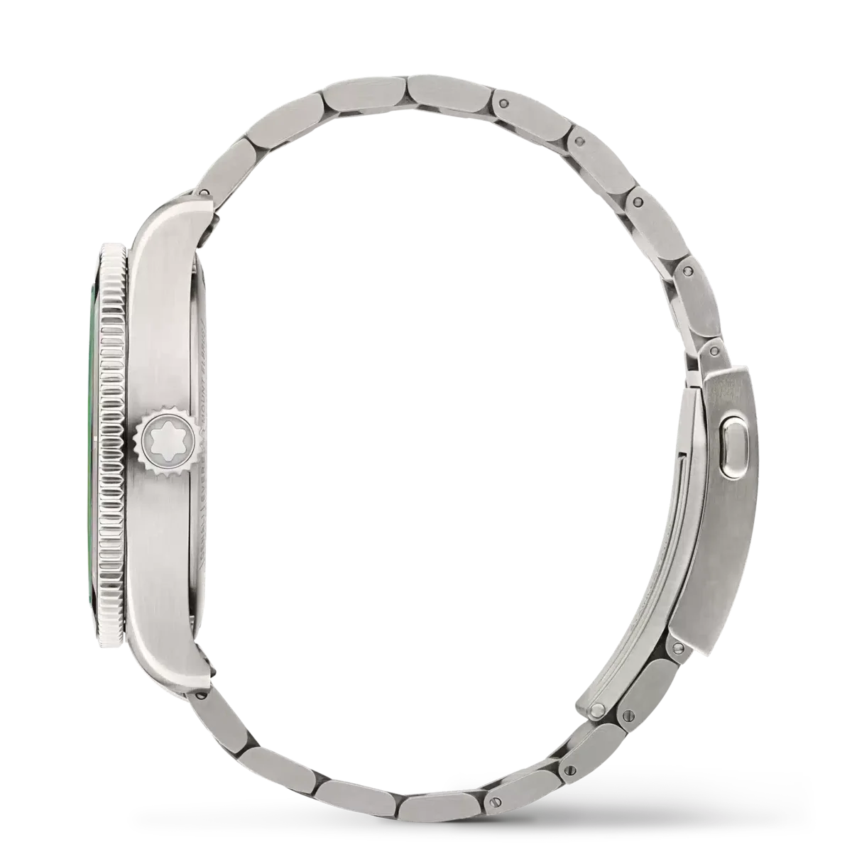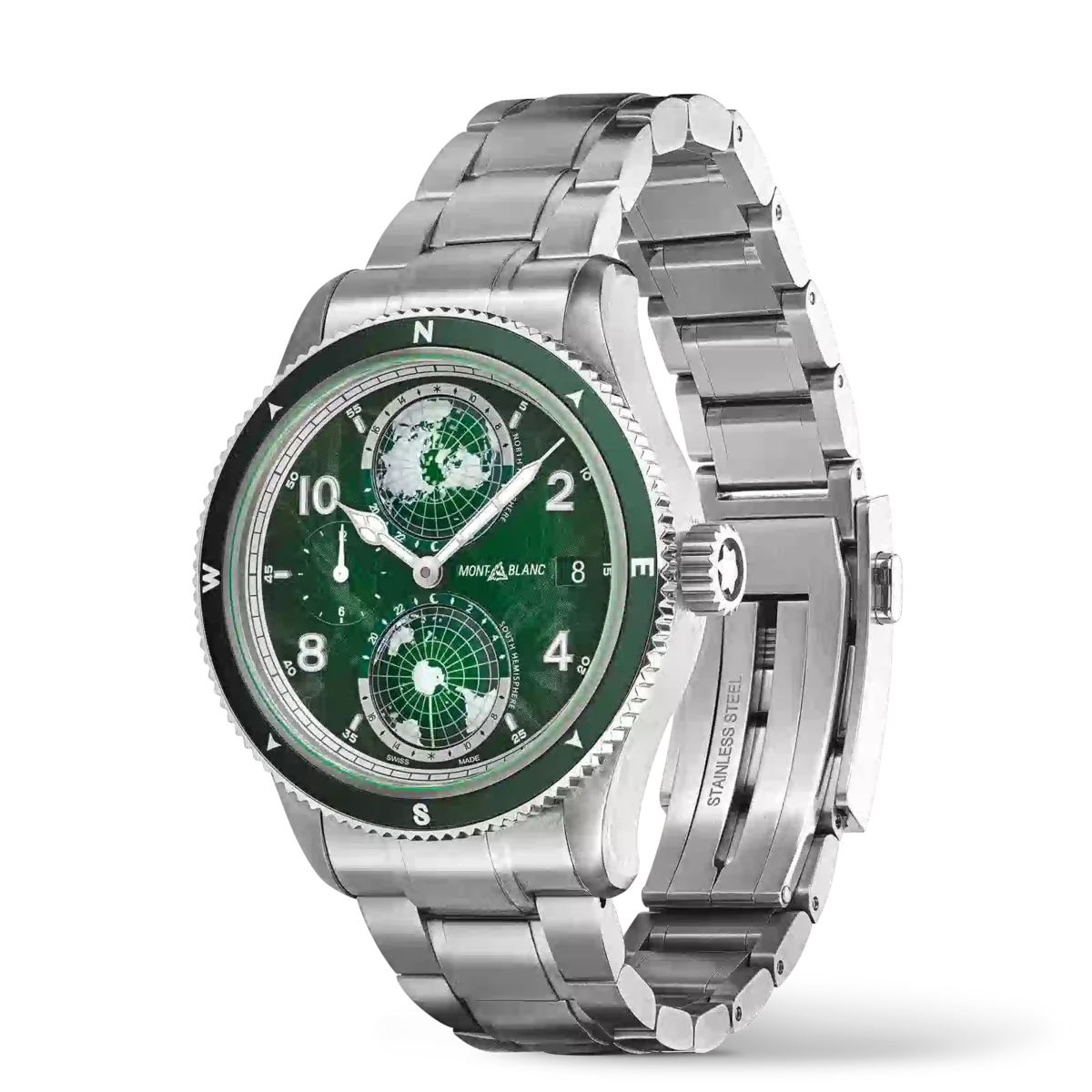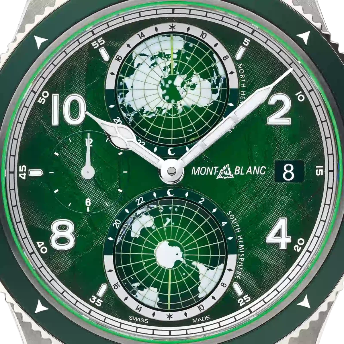 Das sfumato-grüne Zifferblatt mit Gletschermuster dieser Montblanc 1858 Geosphere 0 Oxygen fängt den Geist der Bergbesteigung ein und ist von der tiefgrünen Farbe der smaragdgrünen Eisberge oder „Jadebergs“ inspiriert. Der Zeitmesser ist in einem 42-mm-Edelstahlgehäuse untergebracht, das vollständig sauerstofffrei ist, und verfügt über eine geriffelte, bidirektionale, grün eloxierte Aluminiumlünette mit lumineszierenden Himmelsrichtungen. Angetrieben vom Kaliber MB 29.25 mit der Weltzeitkomplikation aus der Montblanc Manufaktur, verfügt dieses Automatikwerk über drehbare Globusse für die nördliche und südliche Hemisphäre, eine 24-Stunden-Skala, Tag- und Nachtanzeigen, eine Dualzeitanzeige und ein Datum. Eine farbige 3D-Lasergravur des Mont Blanc auf dem Gehäuseboden sowie ein austauschbares Stahlarmband mit einem Verjüngungs- und Feineinstellungssystem runden die Uhr ab. Ident-Nr. MB133303