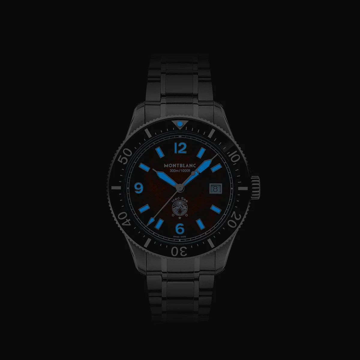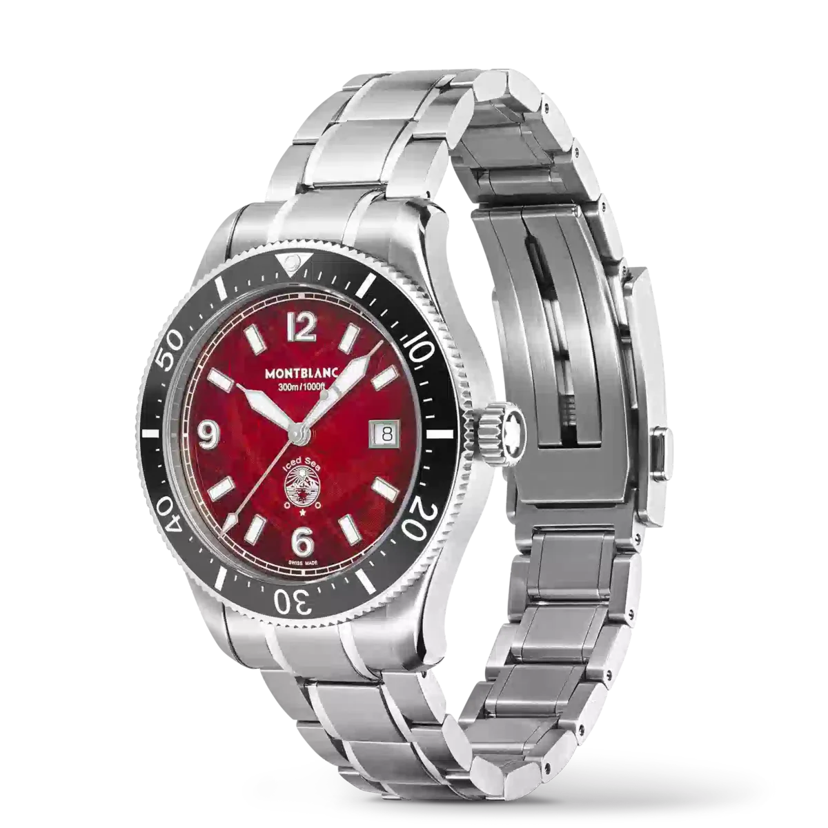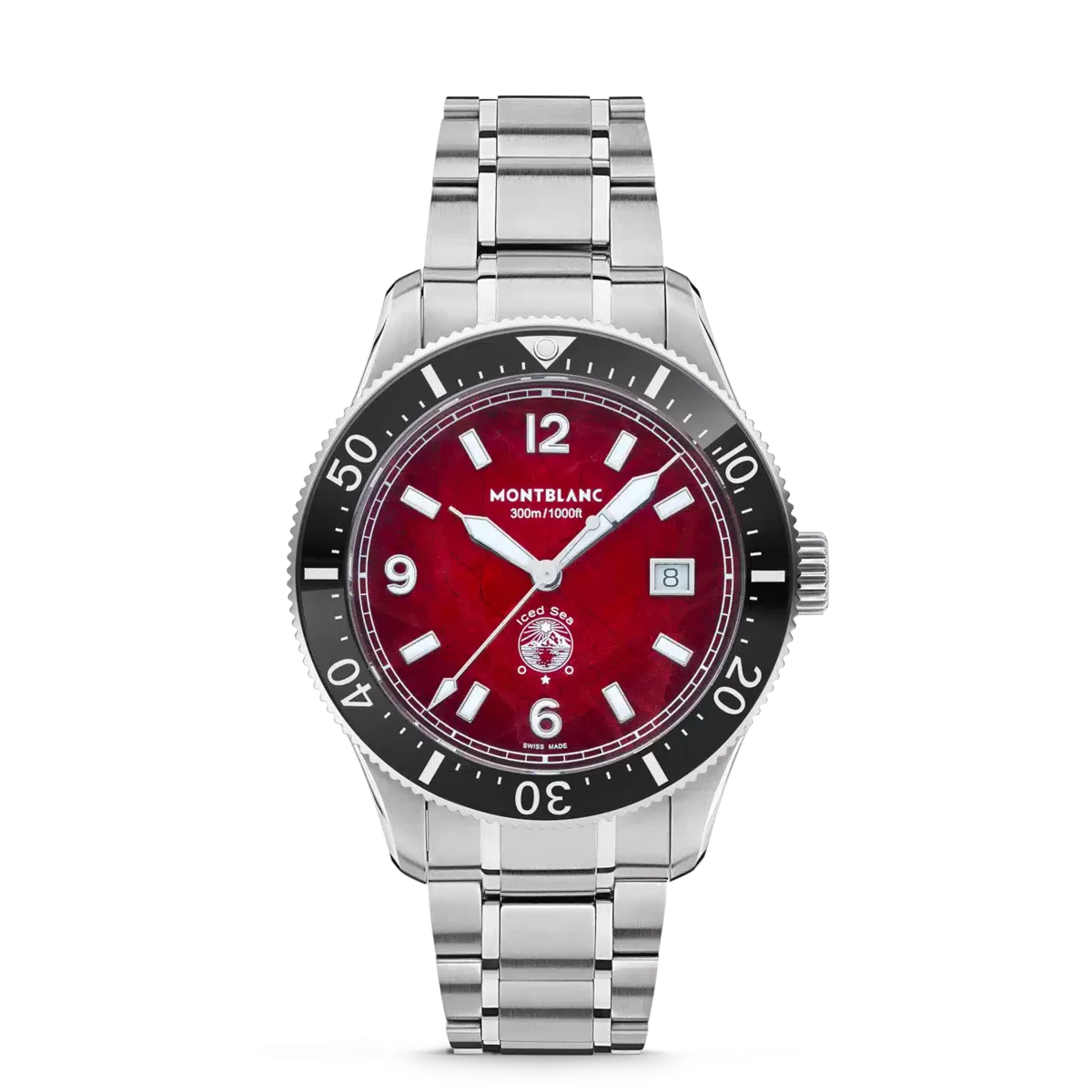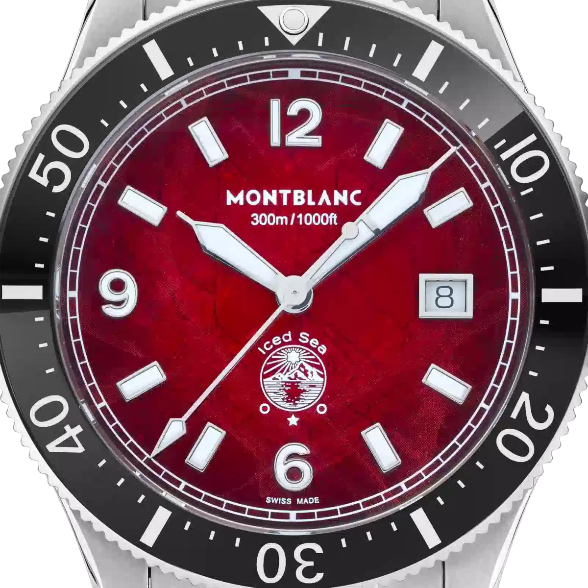 Die Montblanc Iced Sea Automatic Date mit burgunderfarbenem Zifferblatt mit Gletschermuster erinnert an die tiefrote Farbe der Abendsonne, wenn sie auf den Gletscher trifft. Das Zifferblatt mit Gletschermuster ist vom Mer de Glace – dem Eismeer – dem Hauptgletscher des Mont-Blanc-Massivs inspiriert. Seine Textur wurde mit einer fast vergessenen traditionellen Technik namens „gratté-boisé” erzielt. Die Uhr verfügt über eine schwarze, einseitig drehbare Keramiklünette, eine 3D-Gravur auf dem Gehäuseboden und ein austauschbares Edelstahlarmband mit Feineinstellungssystem. Die Uhr entspricht der Norm ISO 6425 für Taucheruhren und ist bis 300 Meter wasserdicht.