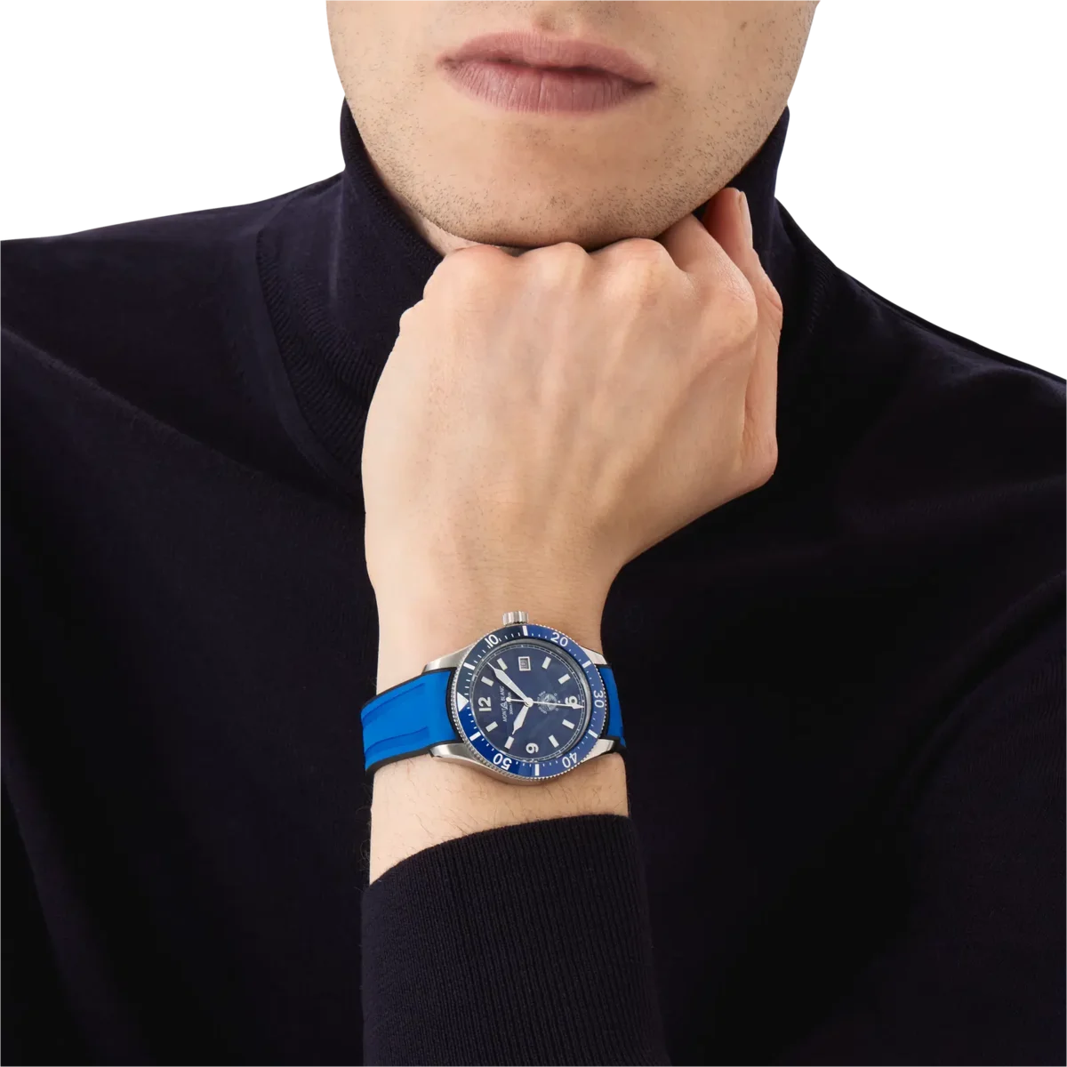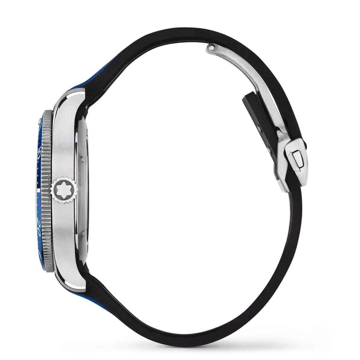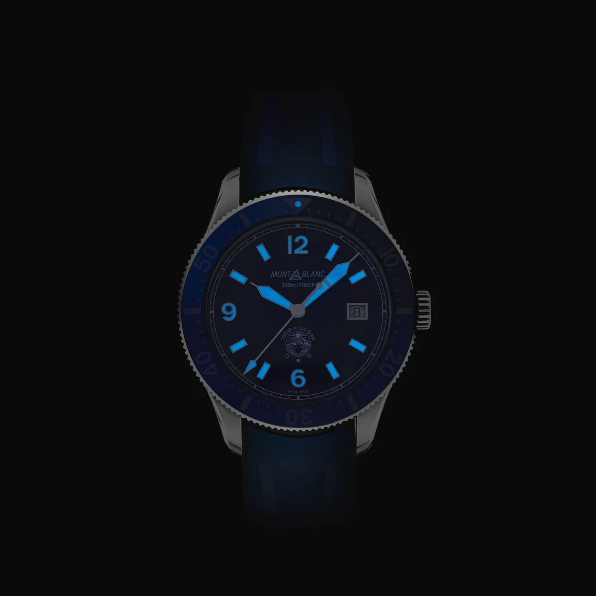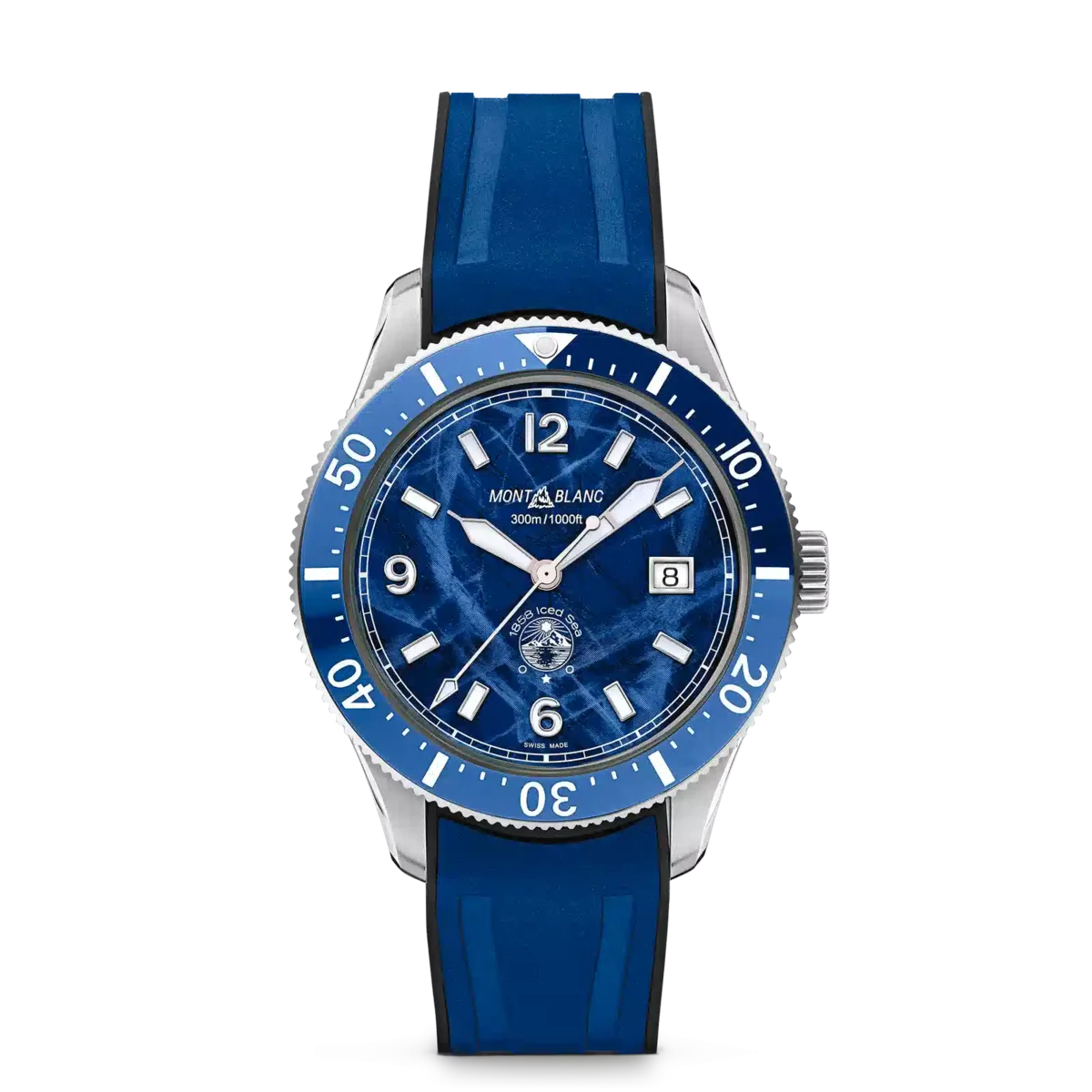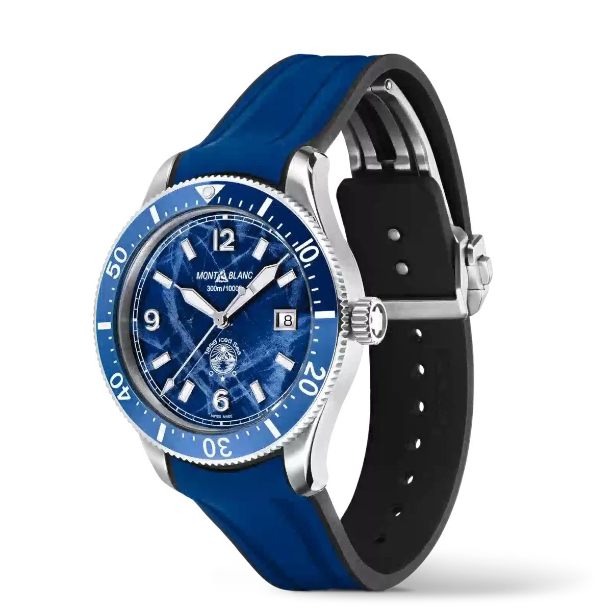 Die Montblanc Iced Sea Automatic Date ist die erste Sporttauchuhr von Montblanc und verfügt über ein Zifferblatt mit Gletschermuster, das den Eindruck vermittelt, in die Tiefen eines Gletschers zu blicken. Dieses blaue Zifferblatt mit Gletschermuster ist von der Mer de Glace – dem Eismeer – dem Hauptgletscher des Mont-Blanc-Massivs inspiriert. Seine Textur wurde mit einer fast vergessenen traditionellen Technik namens „gratté-boisé” erzielt. Der Zeitmesser ist in einem 41-mm-Edelstahlgehäuse untergebracht und verfügt über eine einseitig drehbare zweifarbige Keramiklünette, einen gravierten Gehäuseboden und ein austauschbares blaues Kautschukarmband mit Feineinstellungssystem. Die Uhr entspricht der Norm ISO 6425 für Taucheruhren und ist bis 300 Meter wasserdicht. Ident-Nr. MB129370 Bandanstoßbreite 20 mm