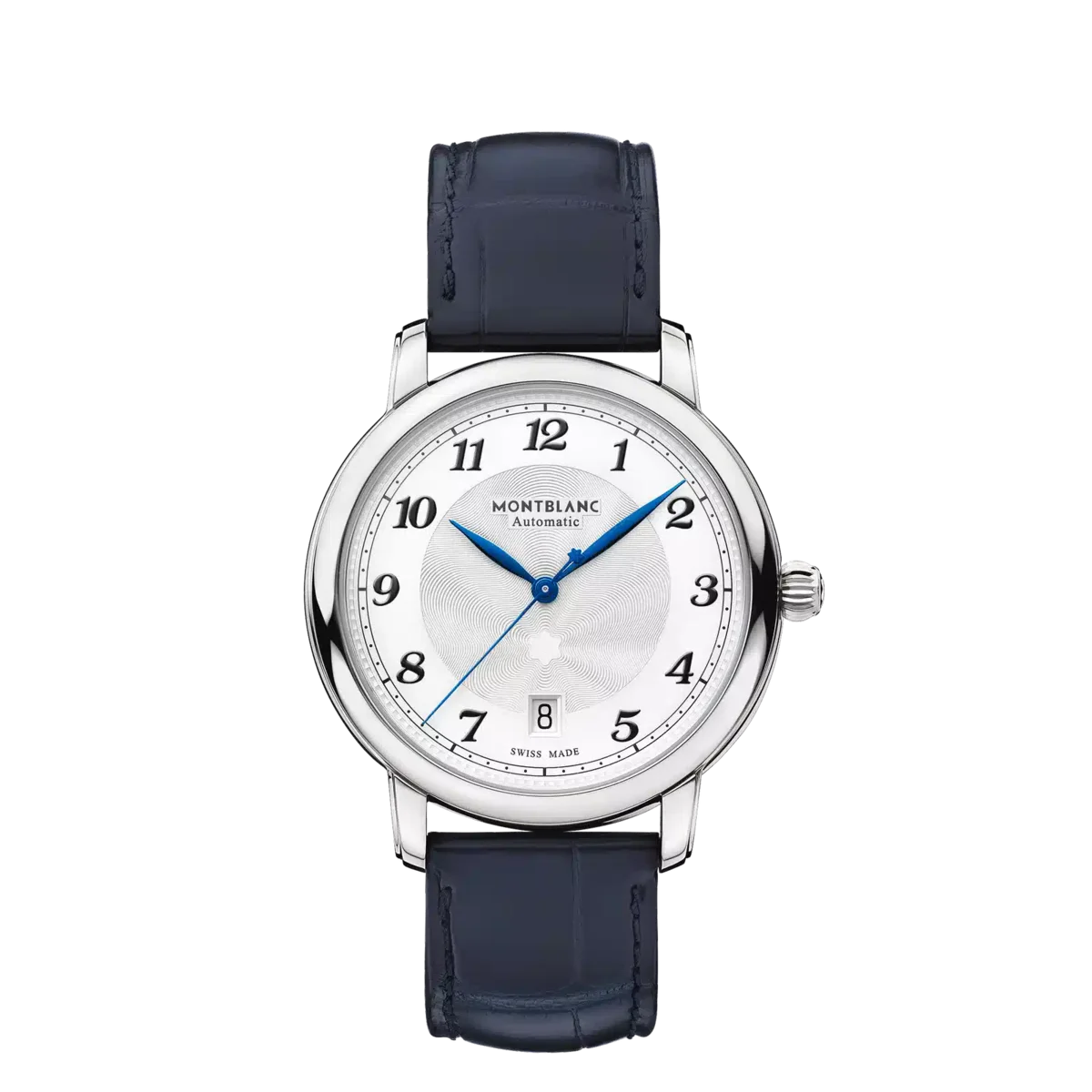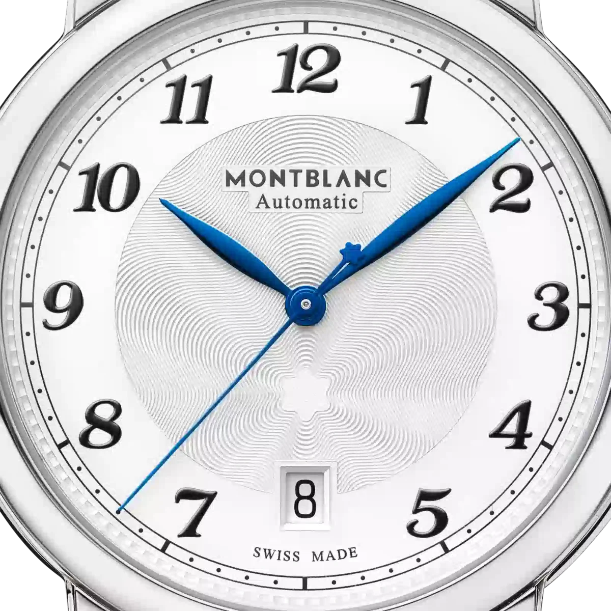 Anlässlich des 20-jährigen Jubiläums der Montblanc Star Kollektion in diesem Jahr erfindet das Maison seine ikonische Kollektion mit Zeitmessern neu, die vom außergewöhnlichen Erbe der Manufaktur Minerva inspiriert sind und sowohl die Ästhetik als auch die Technologie der Kollektion neu interpretieren. Die Star Legacy Automatic Date ist der reinste Zeitmesser der Kollektion. Er weist alle Designmerkmale der Linie auf, darunter ein raffiniertes Zifferblatt mit dem ikonischen Montblanc-Guilloché-Muster in Form einer explodierenden Stern, blattförmige Stunden- und Minutenzeiger, neu gestaltete arabische Ziffern im Breguet-Stil, die an die historischen Minerva-Taschenuhren erinnern, ein Filet Sauté (auf- und absteigende Guilloché-Linien), eine einzigartige Eisenbahnminutenbahn und ein Sekundenzeiger mit dem Montblanc-Emblem an der Spitze. Die Uhr hat ein 39-mm-Edelstahlgehäuse, ein silberweißes Zifferblatt und ein blaues Alligatorlederarmband, das von der Montblanc Pelletteria in Florenz, Italien, gefertigt wurde. Ident-Nr. MB117574 Bandanstoßbreite 19 mm