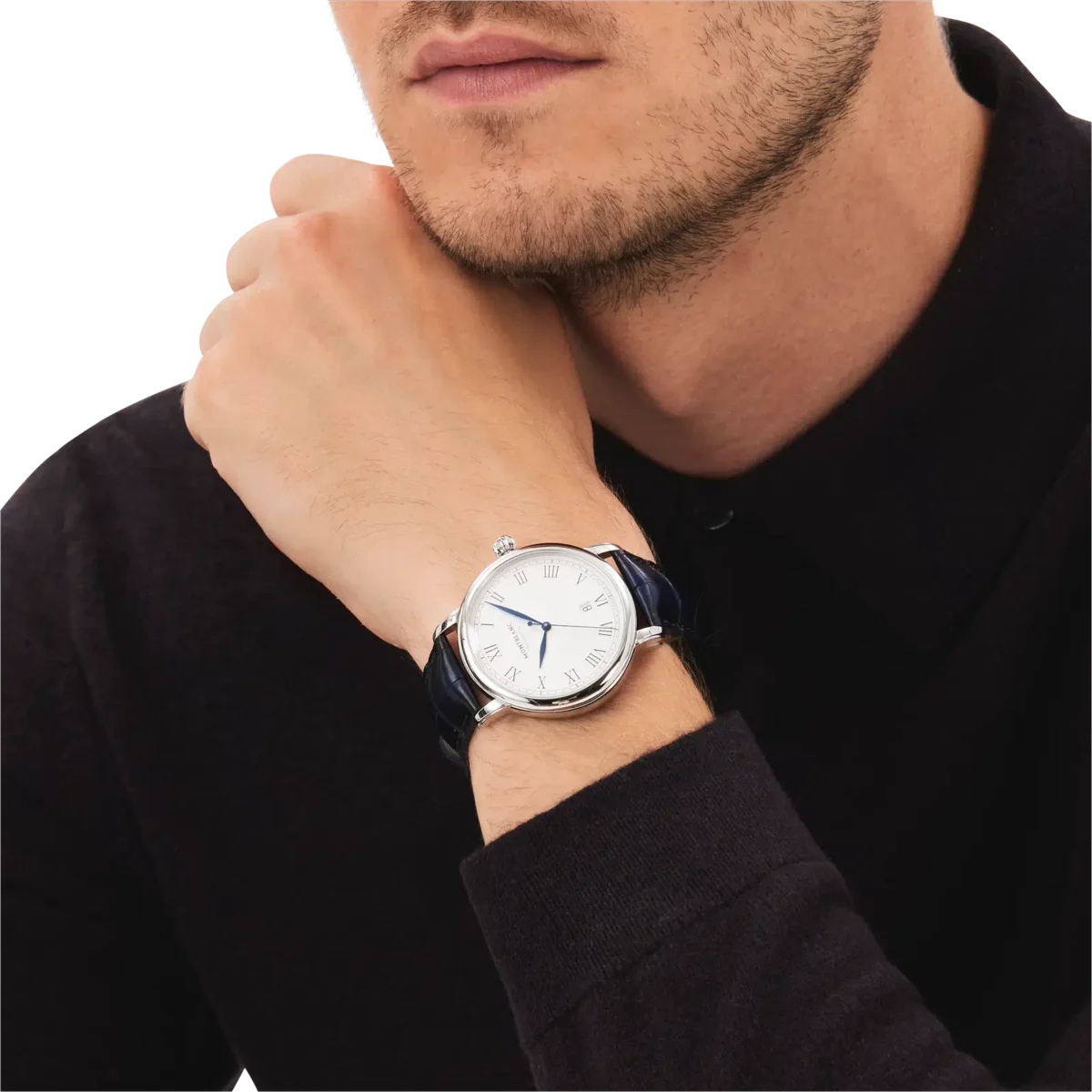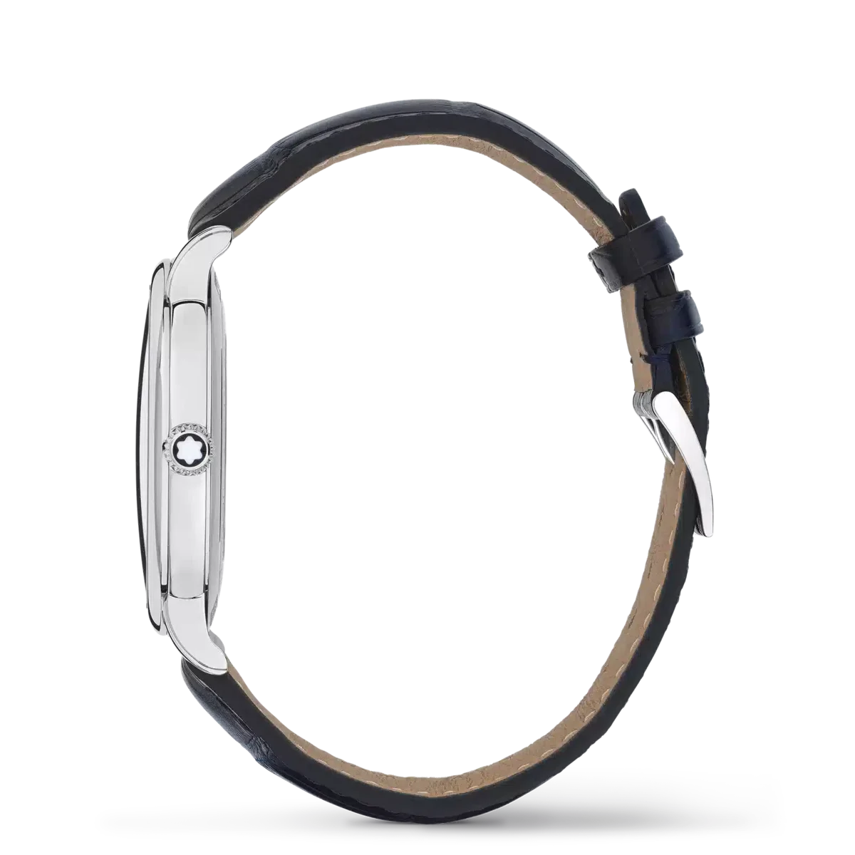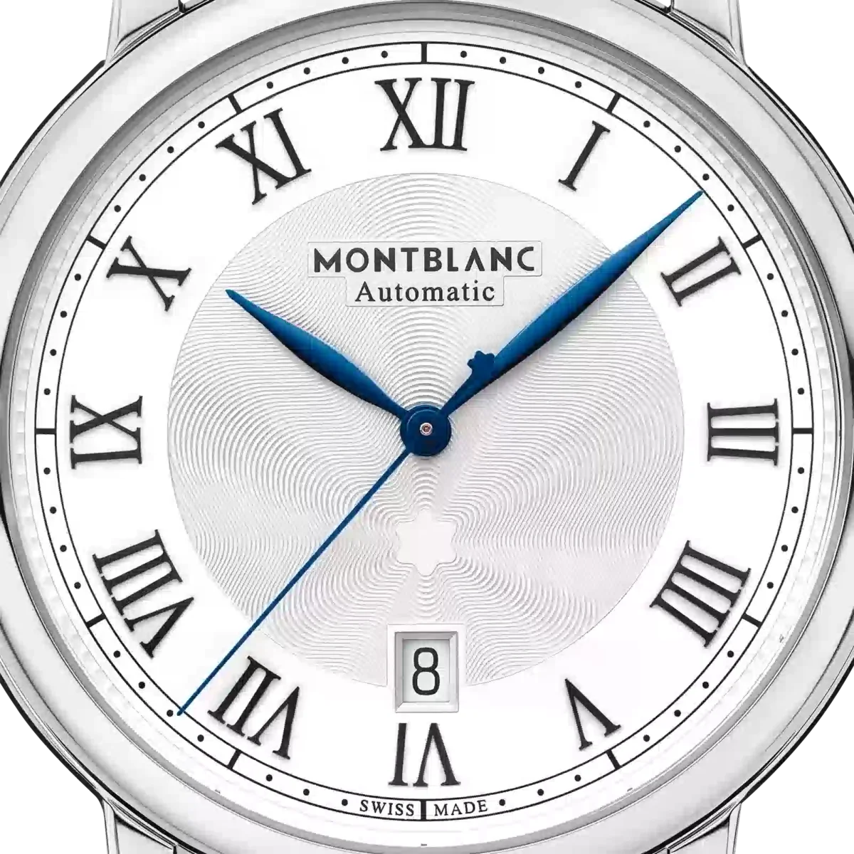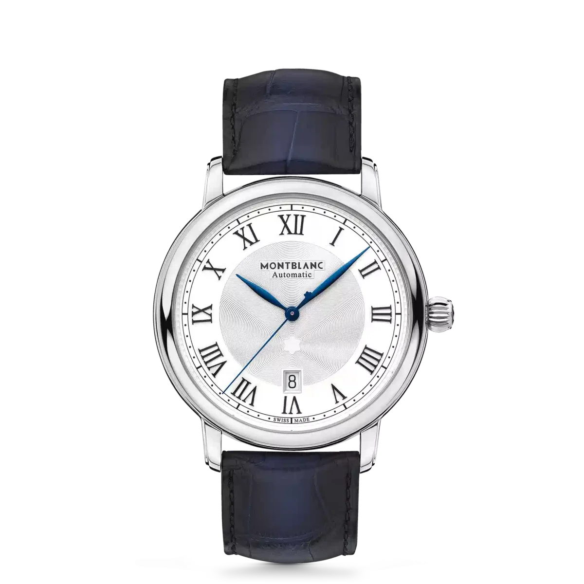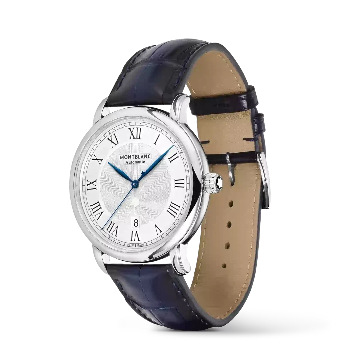 Die Produktlinie Montblanc Star Legacy ist inspiriert vom Erbe von Minerva und den Taschenuhren des Unternehmens, die im späten 19. und frühen 20. Jahrhundert hergestellt wurden. Entsprechend den Designvorgaben der Produktreihe verfügt die Montblanc Star Legacy Automatic Date über ein raffiniertes silberweißes Zifferblatt mit dem Montblanc-Guilloché-Muster „Exploding Star“, römischen Ziffern, blattförmigen Zeigern, einem „Filet Sauté“-Guilloché-Motiv und einer Eisenbahnminuterie. Die Uhr ist mit dem Automatikwerk MB 24.09 ausgestattet und verfügt über eine Stunden-, Minuten- und Sekundenanzeige in der Mitte sowie eine Datumsanzeige in einem Fenster bei 6 Uhr. Er wird in einem 42-mm-Edelstahlgehäuse geliefert und ist mit einem trendigen blauen Sfumato-Alligatorlederarmband ausgestattet. Ident-Nr. MB131209 Bandanstoßbreite 21 mm