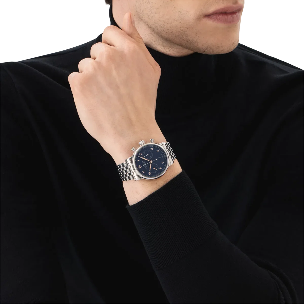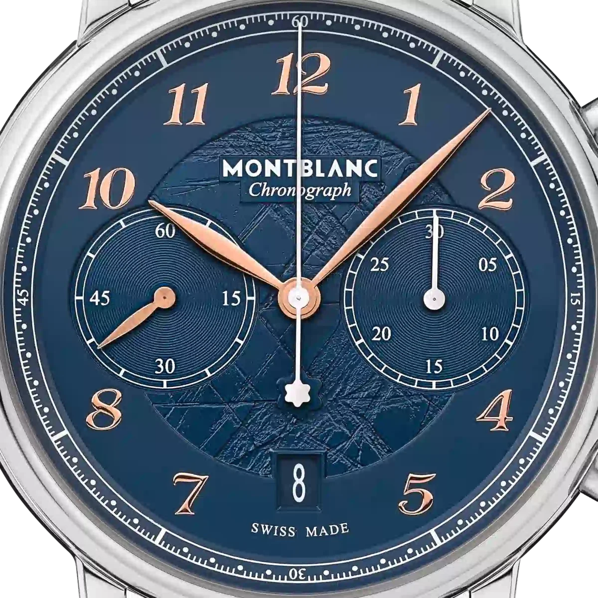 Der Montblanc Star Legacy Chronograph ist auf 1786 Stück limitiert und verfügt über ein 42 mm großes, kieselsteinförmiges Edelstahlgehäuse mit rosévergoldeten arabischen Ziffern und einem auffälligen blauen Zifferblatt mit Gletschermuster. Das Zifferblatt ist mit einem mehrschichtigen Eisdesign verziert, das vom Mer de Glace, dem Hauptgletscher des Mont-Blanc, inspiriert wurde. Die Mitte des Zifferblatts wurde mit einem speziellen Stempel gestaltet, der die Textur des Gletschers nachbildet und die „blaue Stunde“ – „l’heure bleue“ – zelebriert, in der bei Sonnenuntergang, wenn der Mond aufgeht und die Sterne zu leuchten beginnen, ein intensives Blau über den Gletscher fällt. Zu dieser Tageszeit erreichte Jacques Balmat als erster Mensch den Gipfel des Mont Blanc – am 7. August 1786 um 18:23 Uhr. Zu den Funktionen gehören Stunden, Minuten, zentrale Sekunden mit einem Montblanc-Emblem auf dem Gegengewicht, Chronograph und Datum, die vom Automatikwerk MB 25.13 angetrieben werden, das durch einen Saphirglasboden bewundert werden kann. Die Zeitfunktionen werden mit roségoldbeschichteten blattförmigen Zeigern angezeigt, während die Chronographenanzeigen mit rhodinierten „Stabzeigern” versehen sind. Die Uhr ist mit einem Edelstahlarmband ausgestattet. Ident-Nr. MB129627
