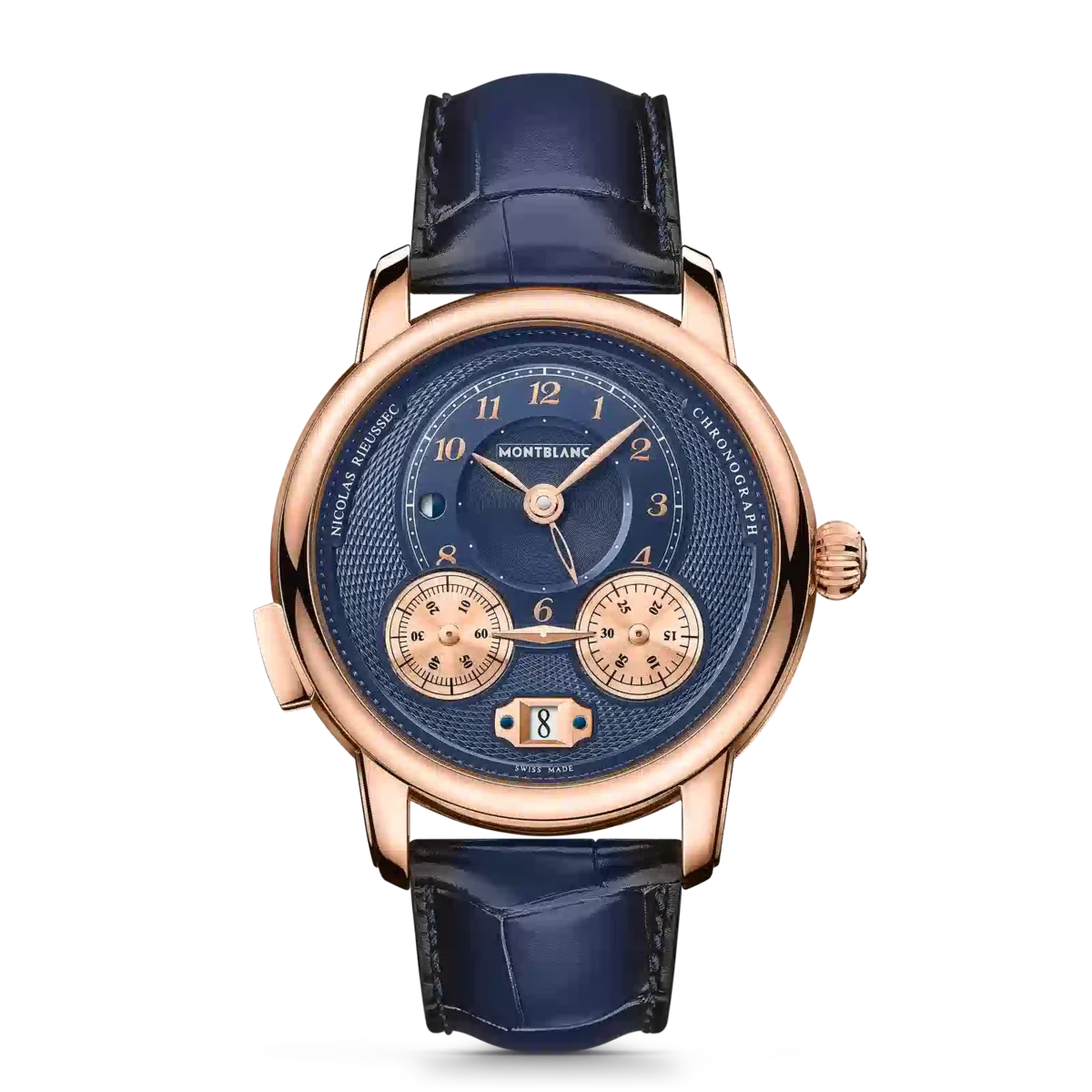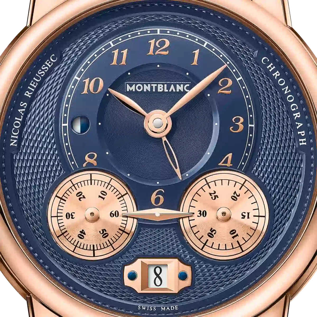 Die Produktlinie Montblanc Star Legacy ist inspiriert vom Erbe von Minerva und den Taschenuhren des Unternehmens, die im späten 19. und frühen 20. Jahrhundert hergestellt wurden. Der Montblanc Star Legacy Nicolas Rieussec Chronograph ist eine Hommage an den französischen Uhrmacher Nicolas Rieussec, der den Tintenchronographen erfand, der 1821 patentiert wurde und die Geschichte der feinen Uhrmacherkunst prägte. Der Zeitmesser verfügt über zwei sehr markante, horizontal ausgerichtete Drehscheiben auf dem Zifferblatt – eine für den 60-Sekunden-Zähler des Chronographen und die andere für den 30-Minuten-Zähler –, die sich wie beim Originalgerät unter einem festen Doppelindex drehen. Sowohl die Zähler als auch der dezentrierte Stunden- und Minutenring sind gewölbt, um einen auffälligen dreidimensionalen Effekt zu erzielen. Die Uhr wird von dem Manufaktur-Monopusher-Chronographenwerk Kaliber MB R200 mit Automatikaufzug und Säulenradmechanismus angetrieben, das durch den Saphirglasboden bewundert werden kann. Das Kaliber verfügt über zwei Federhäuser, die genug Energie für eine Gangreserve von 72 Stunden speichern. Die Montblanc Star Legacy Nicolas Rieussec Chronograph verfügt über ein 44,8 mm großes Gehäuse aus 750/1000 Roségold (18 Karat) mit blauem Zifferblatt und einem passenden blauen Sfumato-Alligatorlederarmband. Ident-Nr. MB126097 Bandanstoßbreite 22 mm