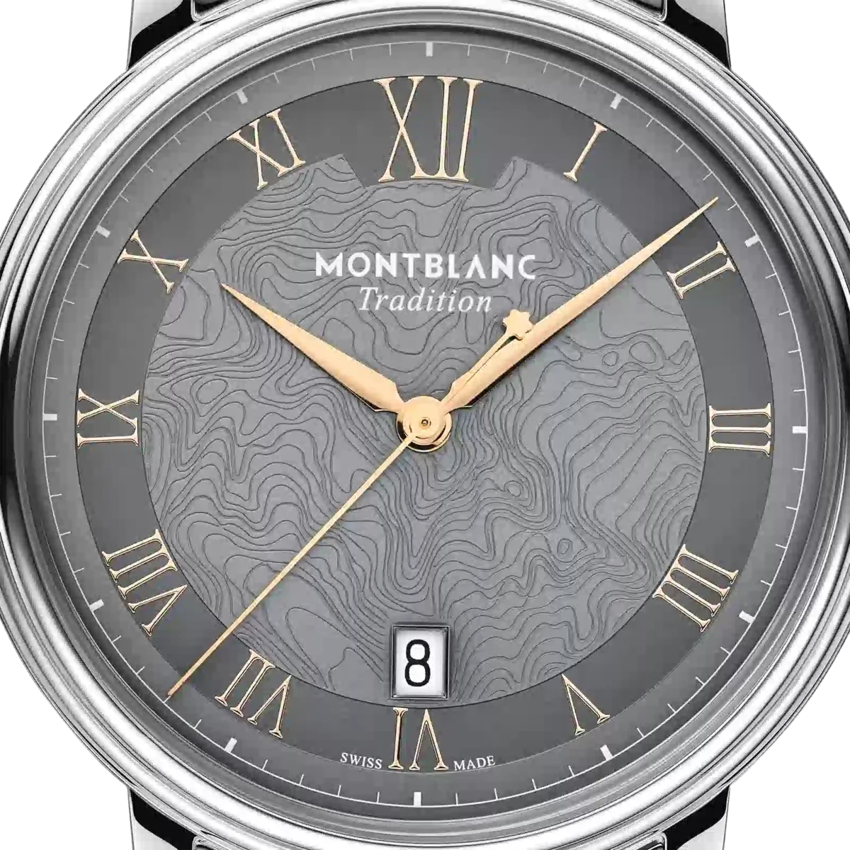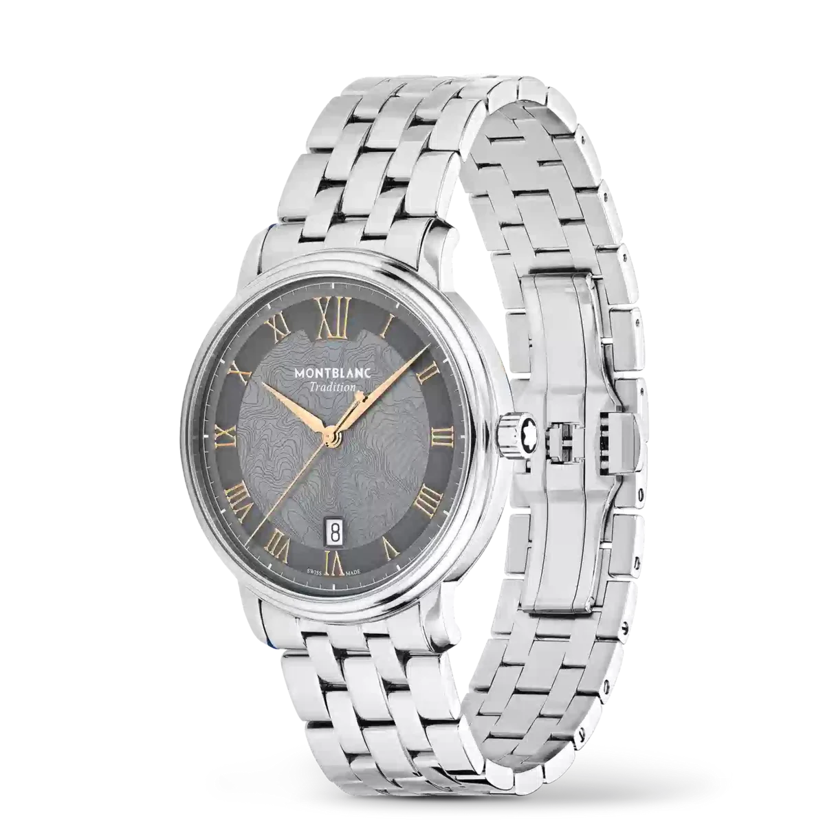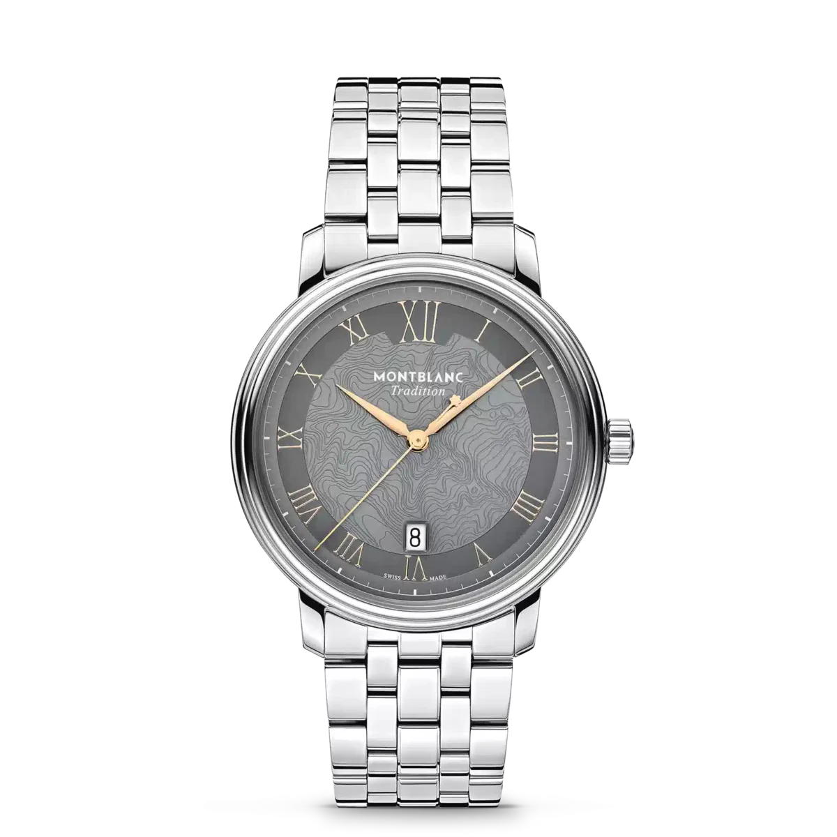 Die Montblanc Tradition Automatic Date verfügt über ein 40-mm-Edelstahlgehäuse mit geraden Bandanstößen und einer doppelt geformten Lünette. Der Zeitmesser verfügt über ein graues Zifferblatt, das die Topografie des Mont Blanc mit roségoldfarbenen römischen Ziffern und einer markanten römischen „XII” darstellt. Die schwertförmigen Stunden- und Minutenzeiger, der Sekundenzeiger und die Krone mit Montblanc Emblem sowie das austauschbare Edelstahlarmband runden das zeitgemäße, elegante Erscheinungsbild ab.