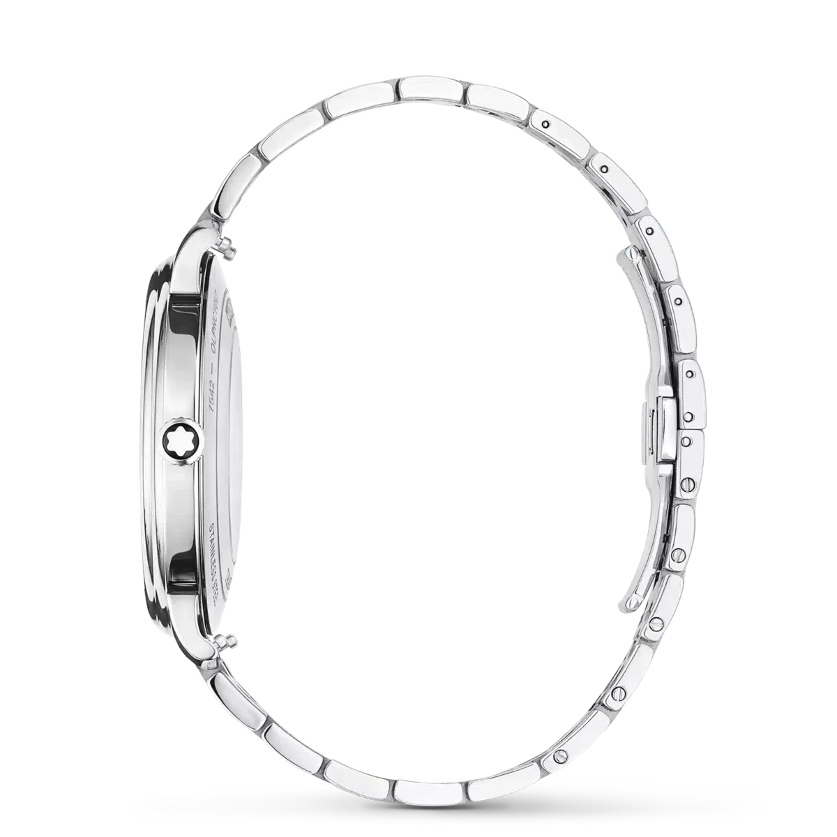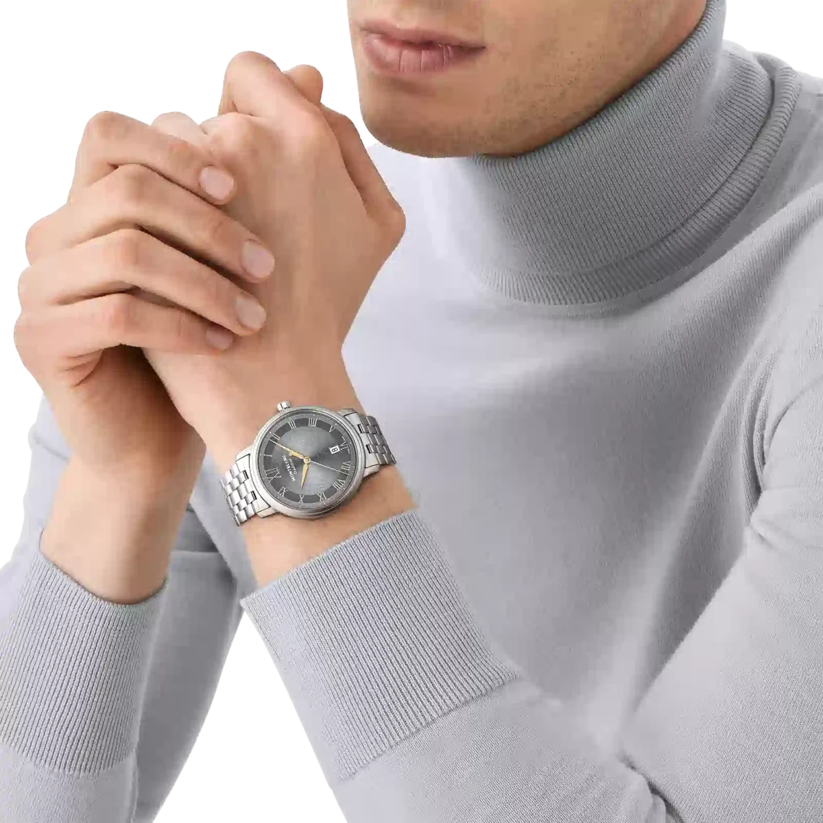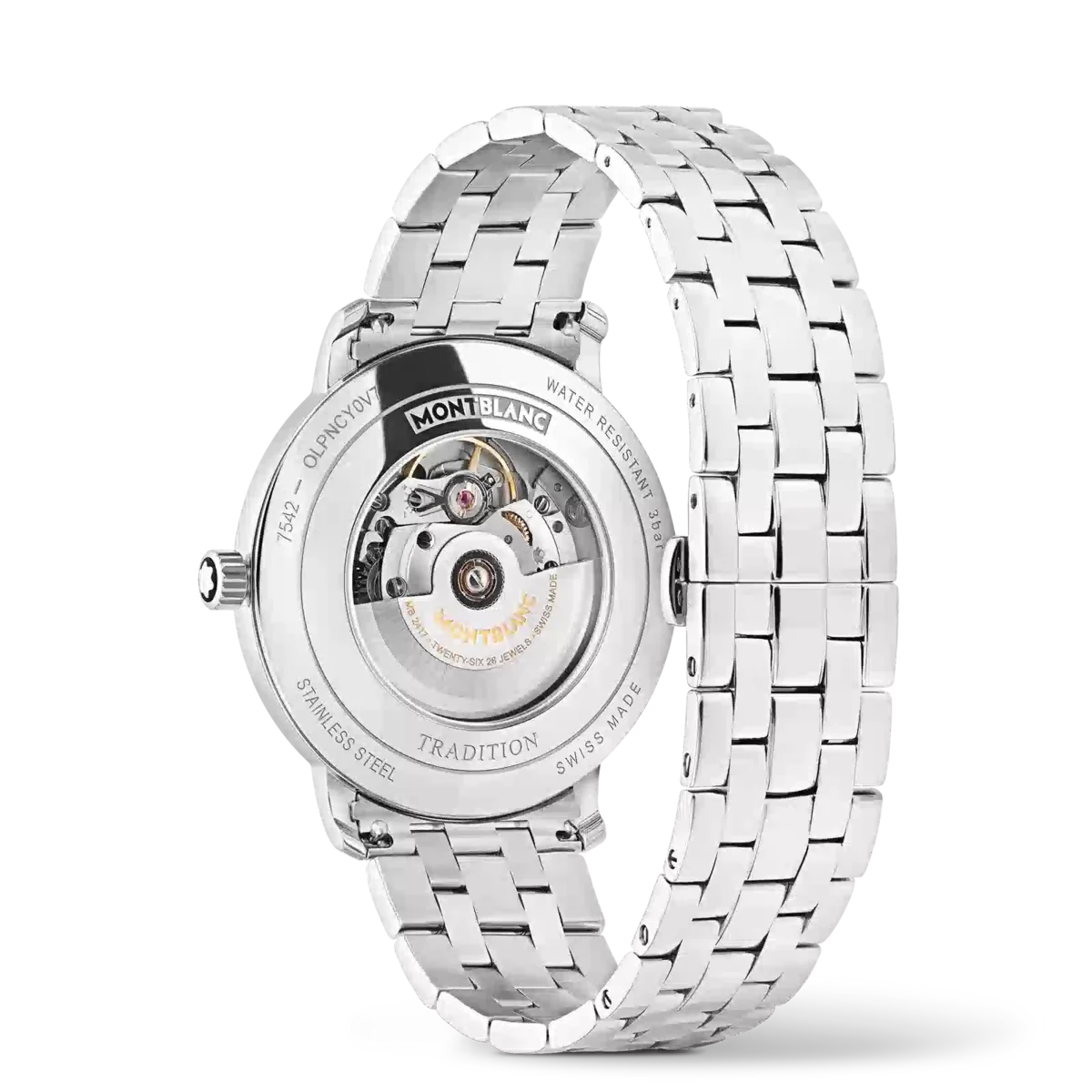 Die Montblanc Tradition Automatic Date verfügt über ein 40-mm-Edelstahlgehäuse mit geraden Bandanstößen und einer doppelt geformten Lünette. Der Zeitmesser verfügt über ein graues Zifferblatt, das die Topografie des Mont Blanc mit roségoldfarbenen römischen Ziffern und einer markanten römischen „XII” darstellt. Die schwertförmigen Stunden- und Minutenzeiger, der Sekundenzeiger und die Krone mit Montblanc Emblem sowie das austauschbare Edelstahlarmband runden das zeitgemäße, elegante Erscheinungsbild ab.