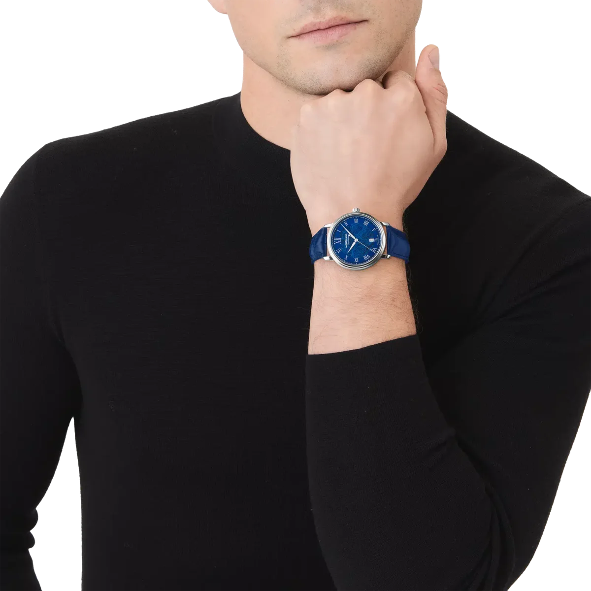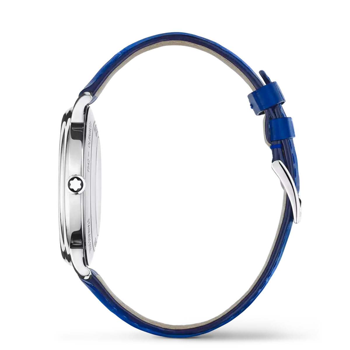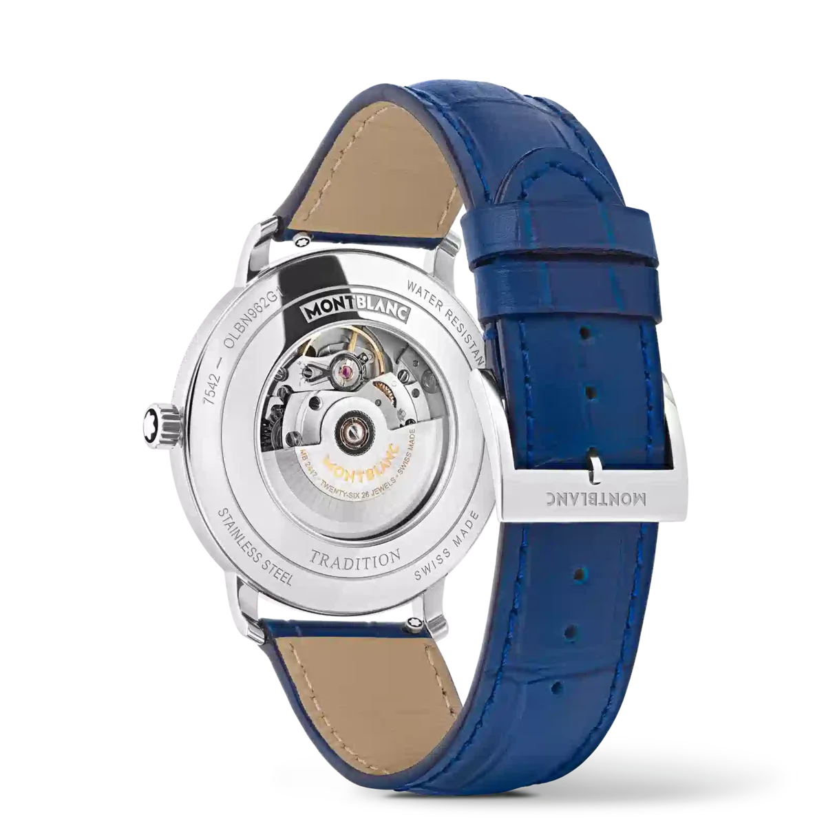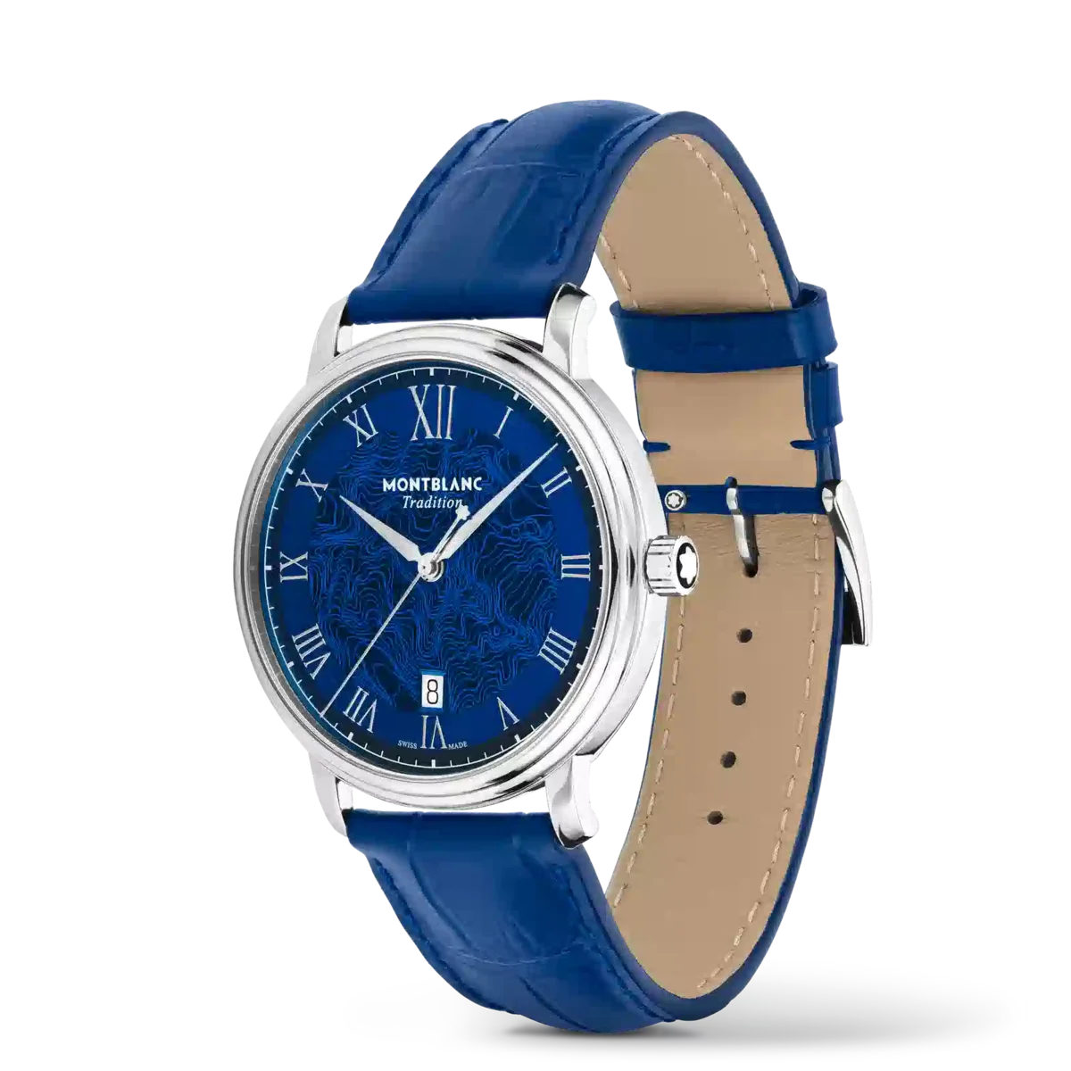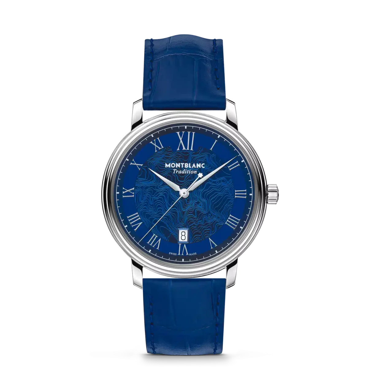 Die Montblanc Tradition Automatic Date verfügt über ein 40-mm-Edelstahlgehäuse mit geraden Bandanstößen und einer doppelt geformten Lünette. Der Zeitmesser verfügt über ein blaues Zifferblatt, das die Topografie des Mont Blanc mit silberfarbenen römischen Ziffern und einer markanten römischen „XII” darstellt. Die schwertförmigen Stunden- und Minutenzeiger, der Sekundenzeiger und die Krone mit Montblanc Emblem sowie das blaue, austauschbare Kalbslederarmband runden das zeitgemäße, elegante Erscheinungsbild ab.