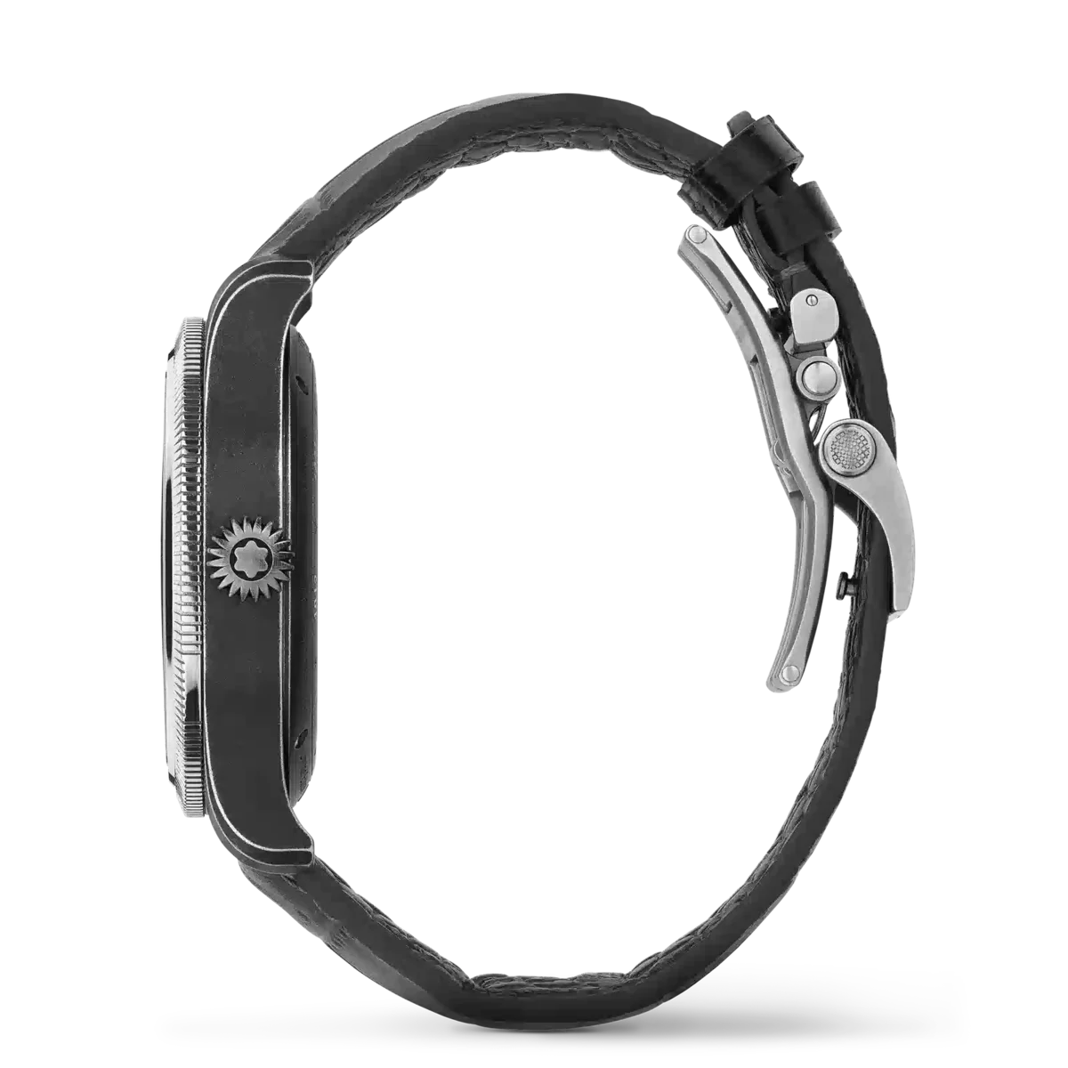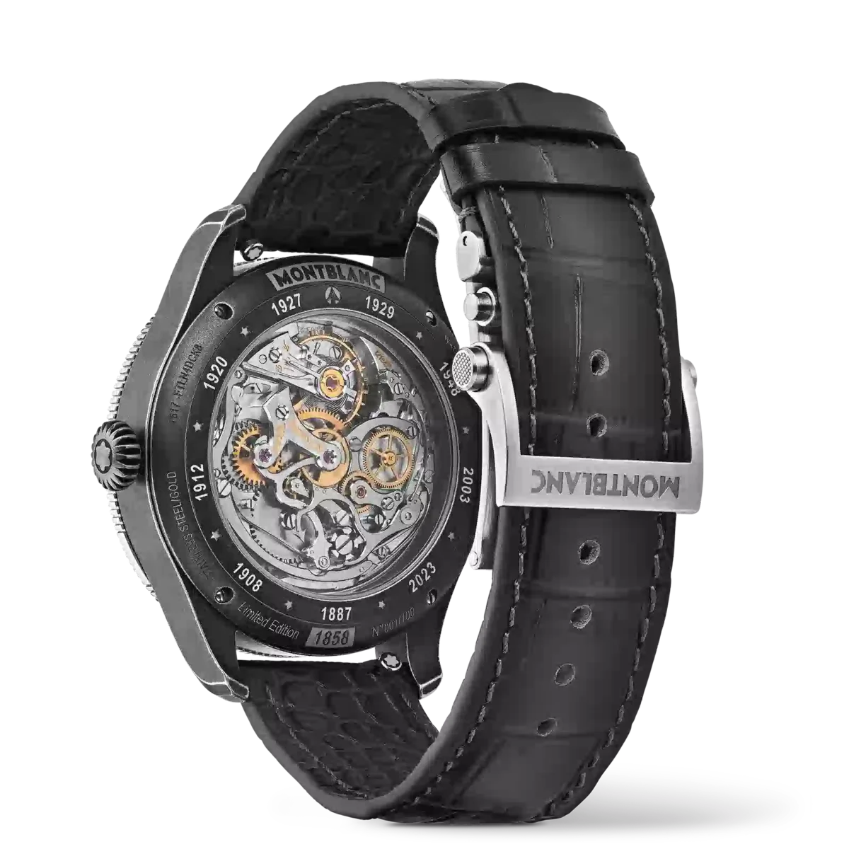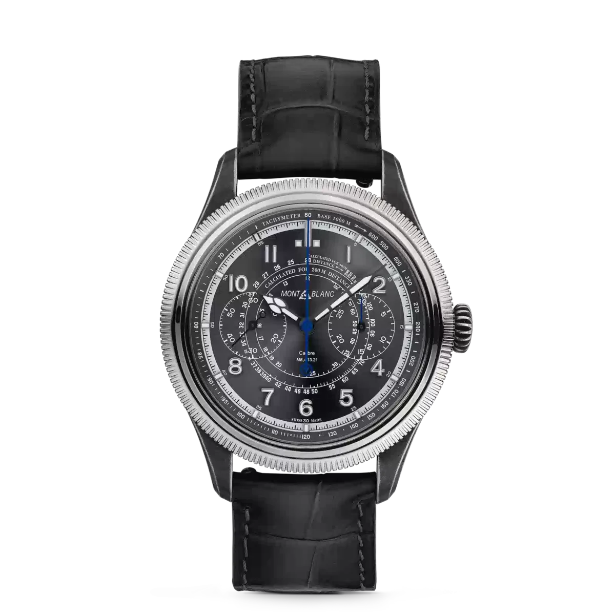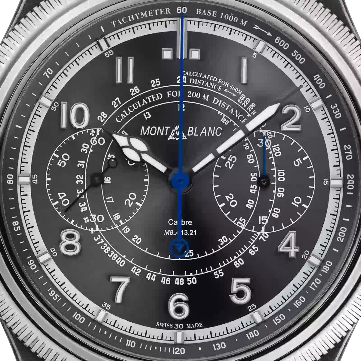 Die Montblanc 1858 Unveiled Timekeeper Minerva Limited Edition denkt das Gewohnte neu. Anstelle traditioneller Drücker wird der Chronograph über die geriffelte Lünette aktiviert. Ein einziger Klick auf die geriffelte Lünette aus 750/1000 (18 Karat) Weißgold startet den Chronographen. Ein zweiter Klick stoppt ihn, ein dritter Klick setzt ihn zurück und verwandelt den Chronographen, wie wir ihn kennen. Die Uhr verfügt über ein 42,5 mm großes Gehäuse aus Distressed-Stahl und ist mit einem grauen Zifferblatt und einem grauen, austauschbaren Kalbslederarmband mit Alligatorprägung ausgestattet. Er wird vom handveredelten Manufakturkaliber MB M13.21 mit Handaufzug angetrieben und ist auf 100 Stück limitiert. Ident-Nr. MB133246 Bandanstoßbreite 21 mm