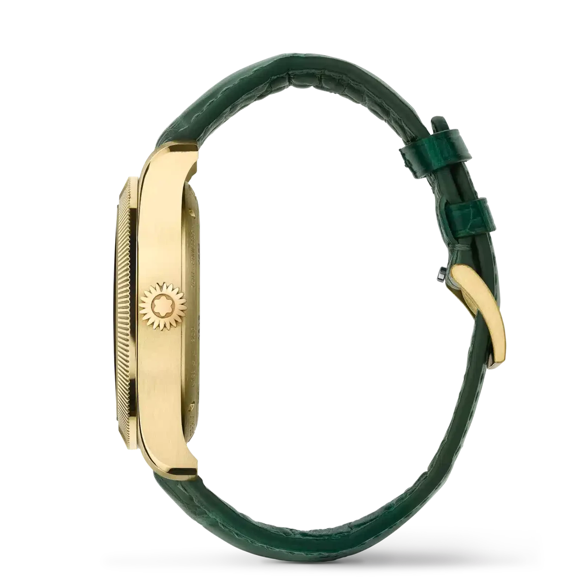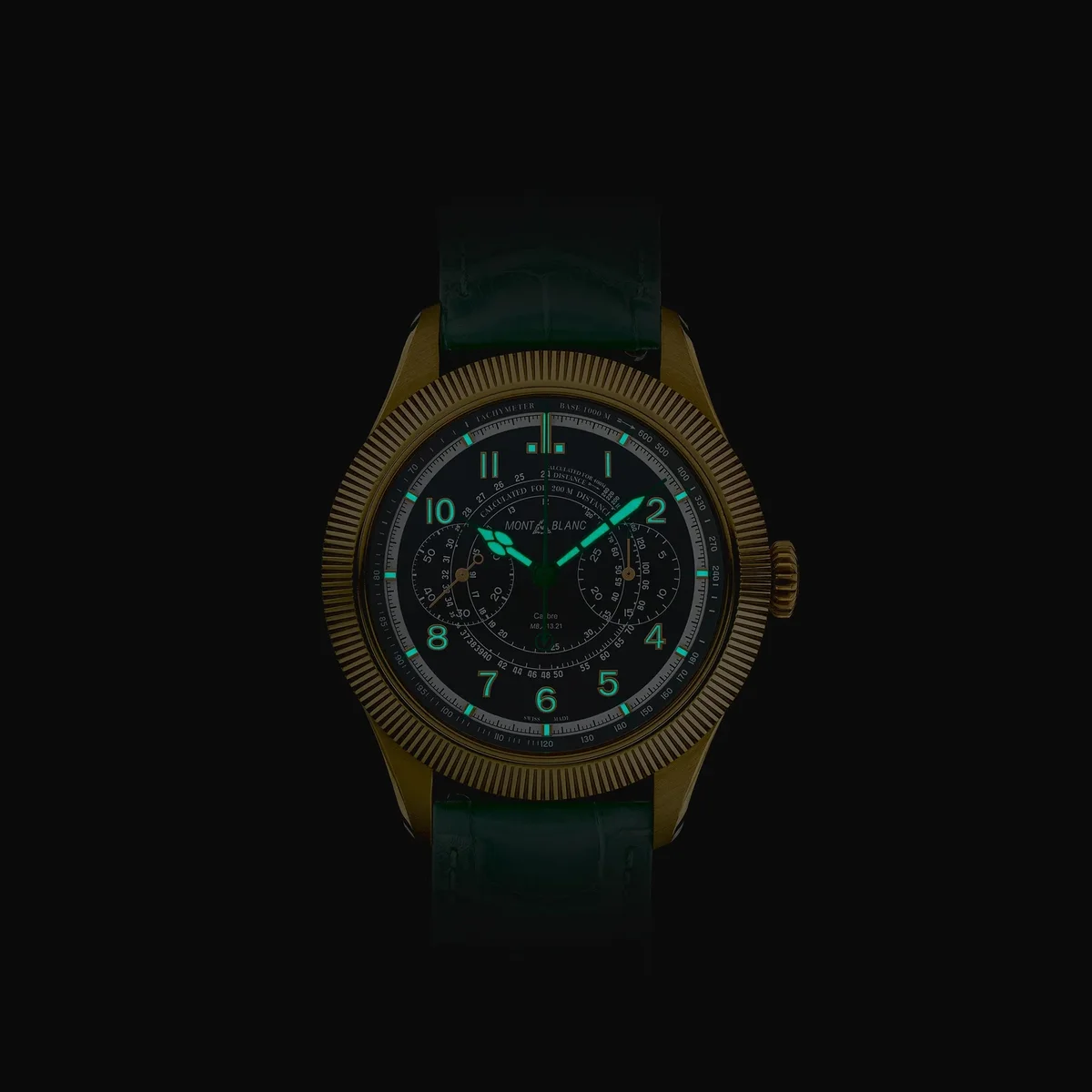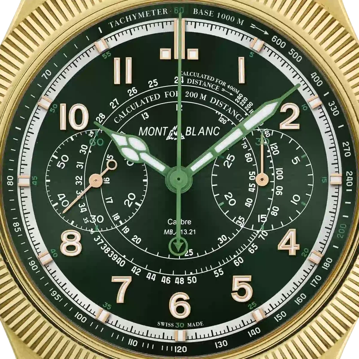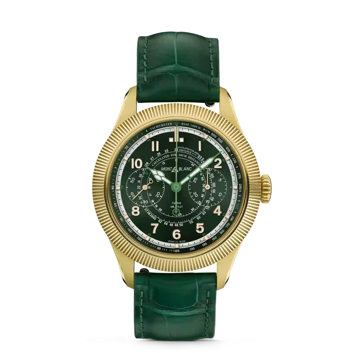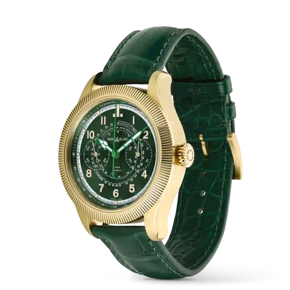 Die Montblanc 1858 Unveiled Timekeeper Minerva Limited Edition verfügt über eine brandneue Chronographenfunktion. Anstelle der traditionellen Drücker wird der Chronograph über die geriffelte Lünette aktiviert. Ein einziger Klick auf die geriffelte Lünette aus Lime Gold 750/1000 (18 Karat) startet den Chronographen. Ein zweiter Klick stoppt ihn, ein dritter Klick setzt ihn zurück und verwandelt den Chronographen, wie wir ihn kennen. Die Uhr verfügt über ein 42,5 mm großes Gehäuse aus Lime Gold 750/1000 (18 Karat) und ist mit einem dunkelgrünen Zifferblatt und einem grünen, austauschbaren Alligatorlederarmband ausgestattet. Er wird vom handveredelten Handaufzugskaliber MB M13.21 angetrieben und ist auf 28 Stück limitiert. Ident-Nr. MB130988 Bandanstoßbreite 21 mm